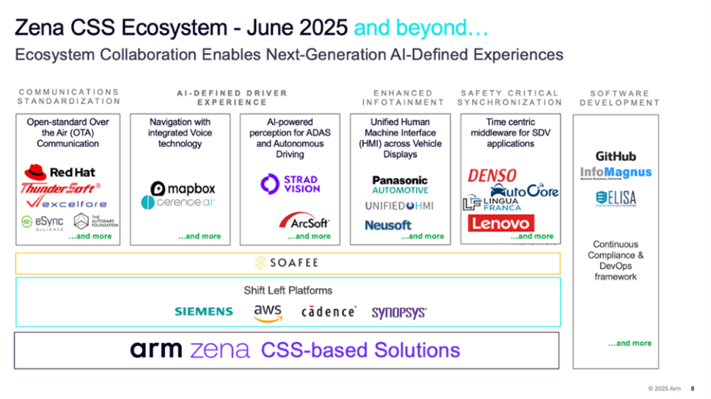 因此,Arm聚焦通過可擴展異構計算與單一平臺實現架構統一,該平臺可靈活適配從入門級車型到高性能域控制器的各類需求。Arm Zena CSS平臺及在SOAFEE等計劃中的布局正體現了這一方向:不強制推行“一刀切”模式,而是在不犧牲安全性與性能的前提下,實現架構一致性、軟件復用性與工作負載整合。
