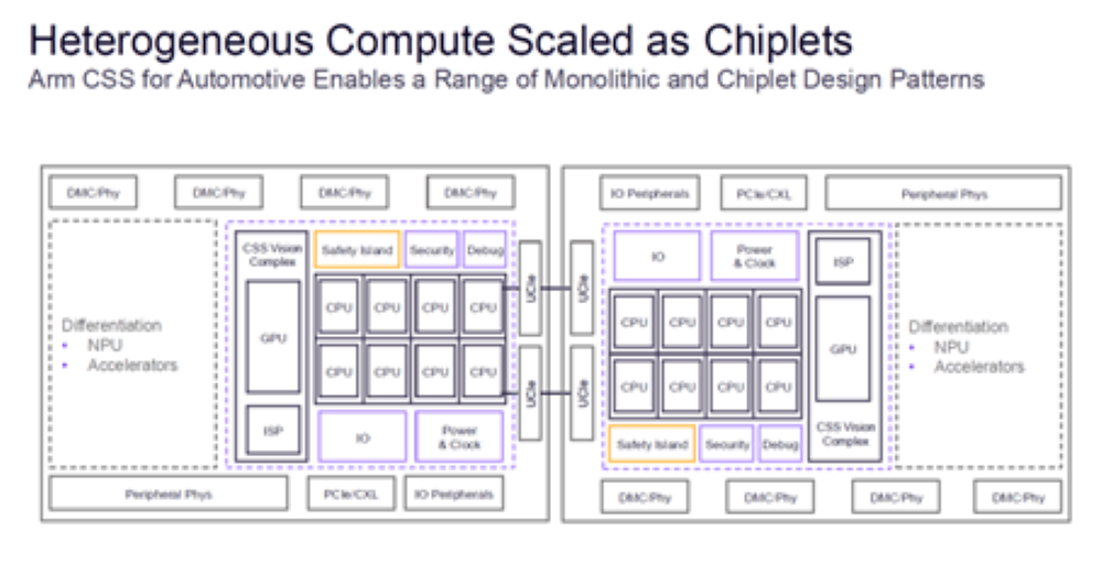 在半導體領域,無論是汽車還是數據中心,一個重大技術趨勢就是“芯粒”(chiplet)。芯粒架構對于滿足各類 AI 應用的算力擴展需求至關重要。Arm的做法是讓Zena CSS(即下圖中紫色框所示部分)原生支持芯粒架構。合作伙伴可通過 UCIe(Universal Chiplet Interconnect Express)互連標準,在單一封裝內集成多個基于Zena CSS的芯粒,從而構建更具擴展性的解決方案。