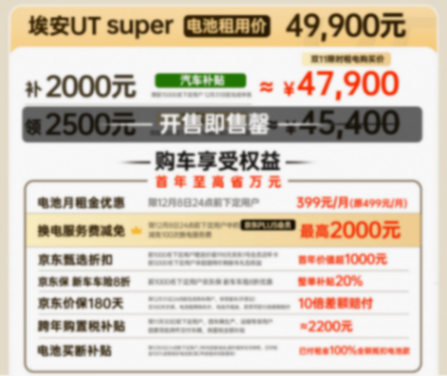 埃安與京東、寧德時代聯合打造的純電兩廂車埃安UT Super于2025年11月9日上市,它基于埃安UT打造,支持了寧德時代的巧克力換電網絡,并在京東商城上架銷售。
