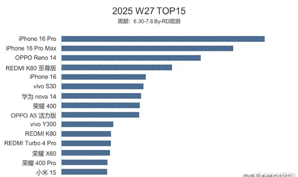 W27周數(shù)據(jù)清清楚楚:OPPO Reno14穩(wěn)坐季軍,Redmi K80至尊版緊隨其后排第四,蘋果的iPhone 16直接跌到第六名。