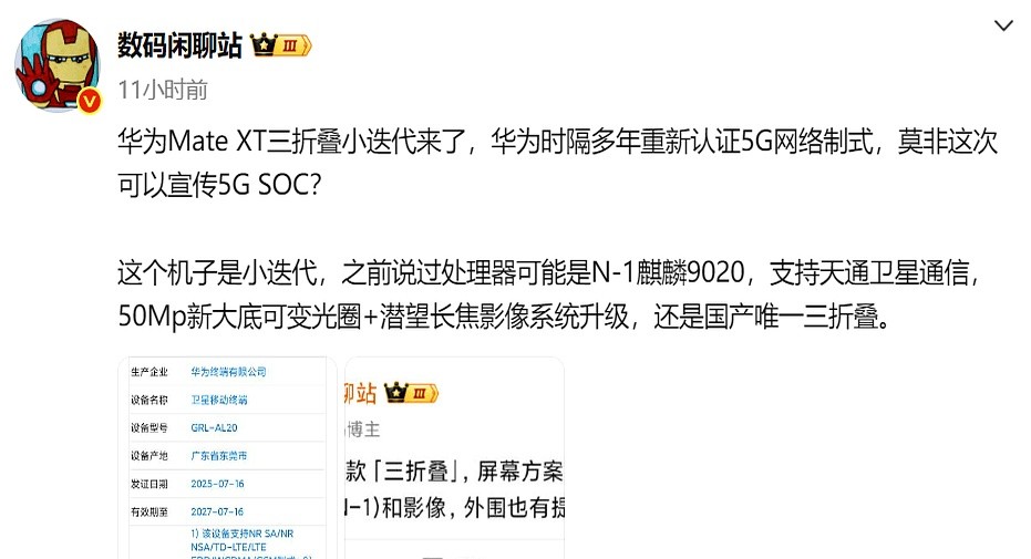 華為新款三折疊手機GRL-AL20正式入網,確認搭載麒麟9020芯片并支持5G,是近兩年首款通過認證的華為5G機型。