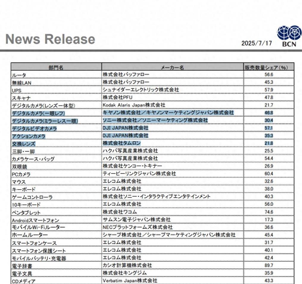 日本市場調(diào)研機構(gòu)BCN公布了2025上半年日本市場數(shù)碼家電產(chǎn)品各大品牌的銷冠名單,基于各大賣場、專賣店的POS數(shù)據(jù)統(tǒng)計,大概能覆蓋40%的日本市場。這里我們看看跟相機相關(guān)的細(xì)分品類的銷冠及其市場份額——