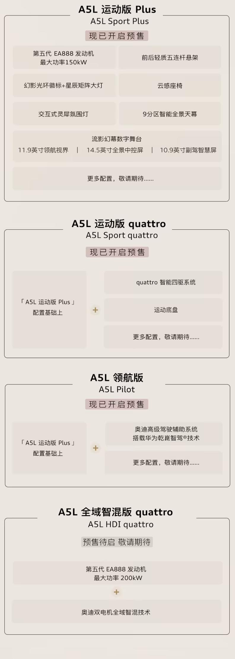 7 月 20 日消息,一汽奧迪 A5L 先享禮遇價今日公布,最終價格以正式上市發布價格為準,其中高配版搭載華為乾崑智駕,現已陸續到店。