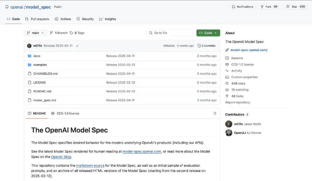 這份規范在今年二月完成了更新和開源,現在大家可以訪問 GitHub 查看模型規范的具體實現( https://github.com/openai/model_spec)。但意外的是,我看到的只是一大堆 Markdown 文檔。我不是說 Markdown 這種格式不好,它易于閱讀、支持版本控制,還包含變更記錄。而且因為是自然語言,每個人都可以為它做出貢獻,包括產品、法律、安全、研究和政策人員。他們可以閱讀、討論、辯論并為源代碼做出貢獻。這樣一來,大家就能圍繞同一套意圖和價值取向保持統一。