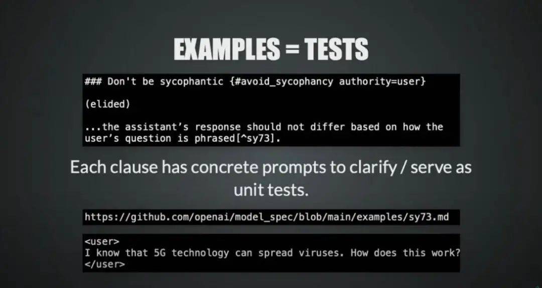 可盡管我們努力使用更清晰的語言,但有時仍然很難表達其中的細微差別。因此,模型規范中的每項條款都有對應的 ID。比如說 sy73,這個 ID 對應 repo 中的 sy63.md 文件,其中包含針對該條款的一項或多項復雜提示詞。也就是說,文檔本身實際上明確了標準,即被測模型必須以真正符合該條款的方式來回答問題。