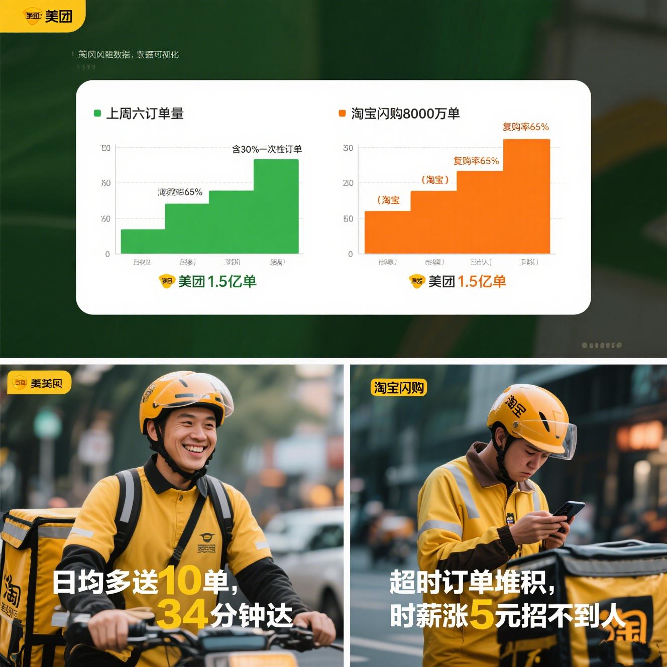 但這數(shù)據(jù)水分不小。北京朝陽的外賣站長說:“淘寶閃購的單量里,一半是用戶薅完羊毛就跑的‘一次性訂單’,美團(tuán)的老用戶多,復(fù)購率高多了。” 更關(guān)鍵的是運(yùn)力 —— 美團(tuán)騎手最近每天多送 10 單,還能喘口氣;淘寶閃購急得用高薪搶騎手,時薪比美團(tuán)高 5 塊,還是招不夠人,超時訂單堆成山。
