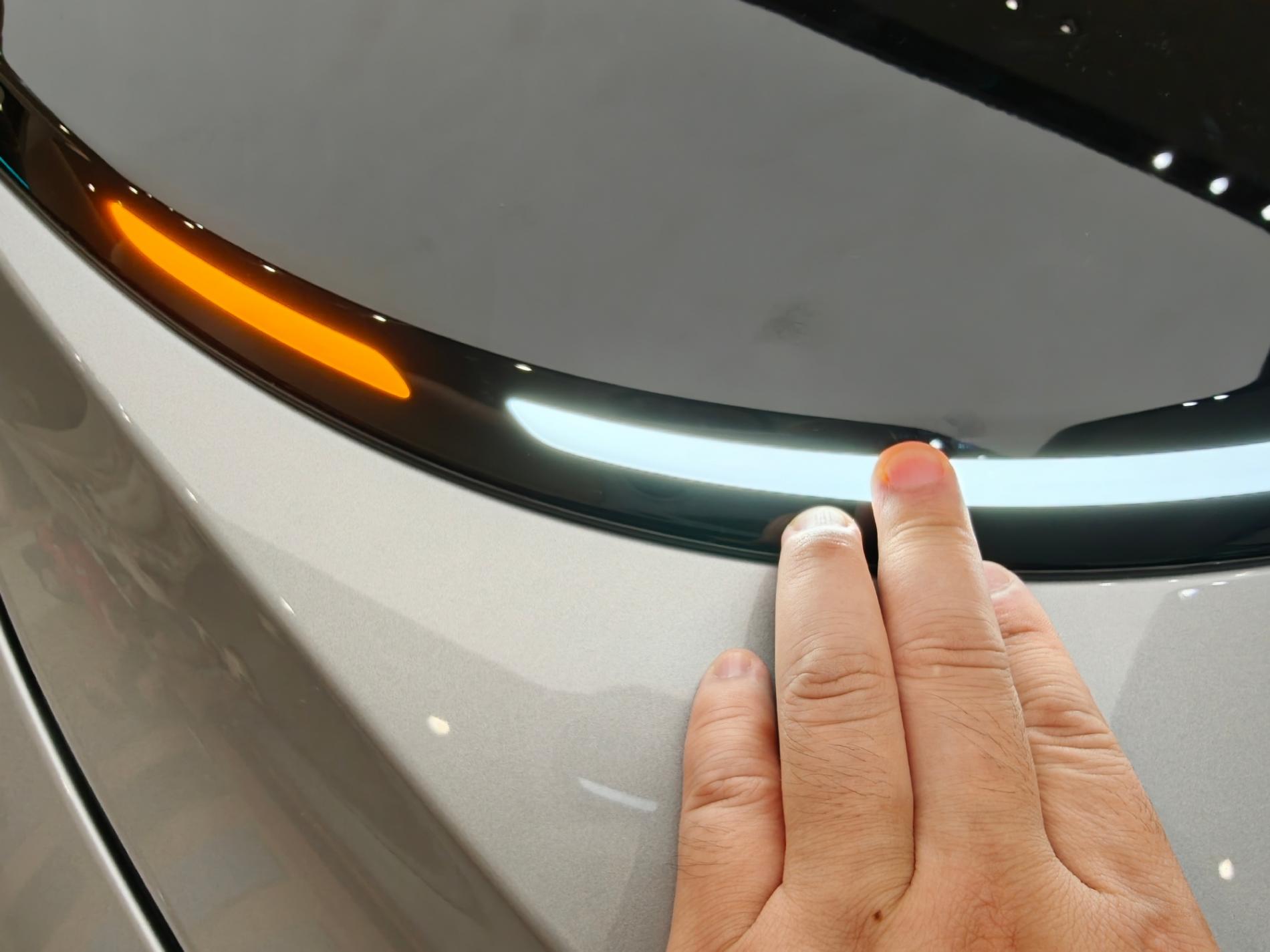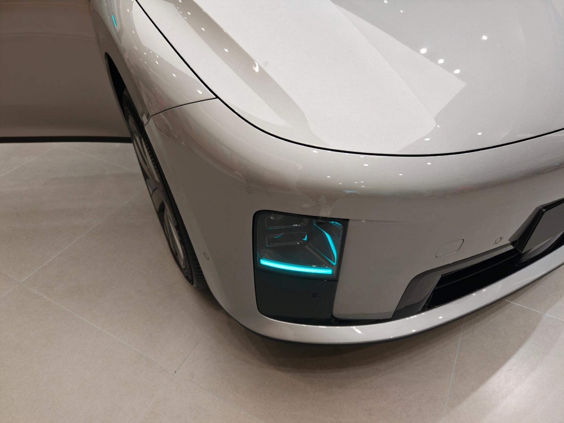 2、造型上理想i8就是MEGA的縮小版,星環燈設然不是嵌入在飾板上,而是透光設計,沒有縫隙差,非常光滑。車頭令人印象深刻的是引擎蓋上的兩條棱線,直接從車窗下沿延伸出來,整體感很強。只是快接近引擎蓋的時候,轉折感有點明顯,不是順著前臉的倒角弧度來做的。另外,前大燈也做了小藍燈設計,科技感更強。