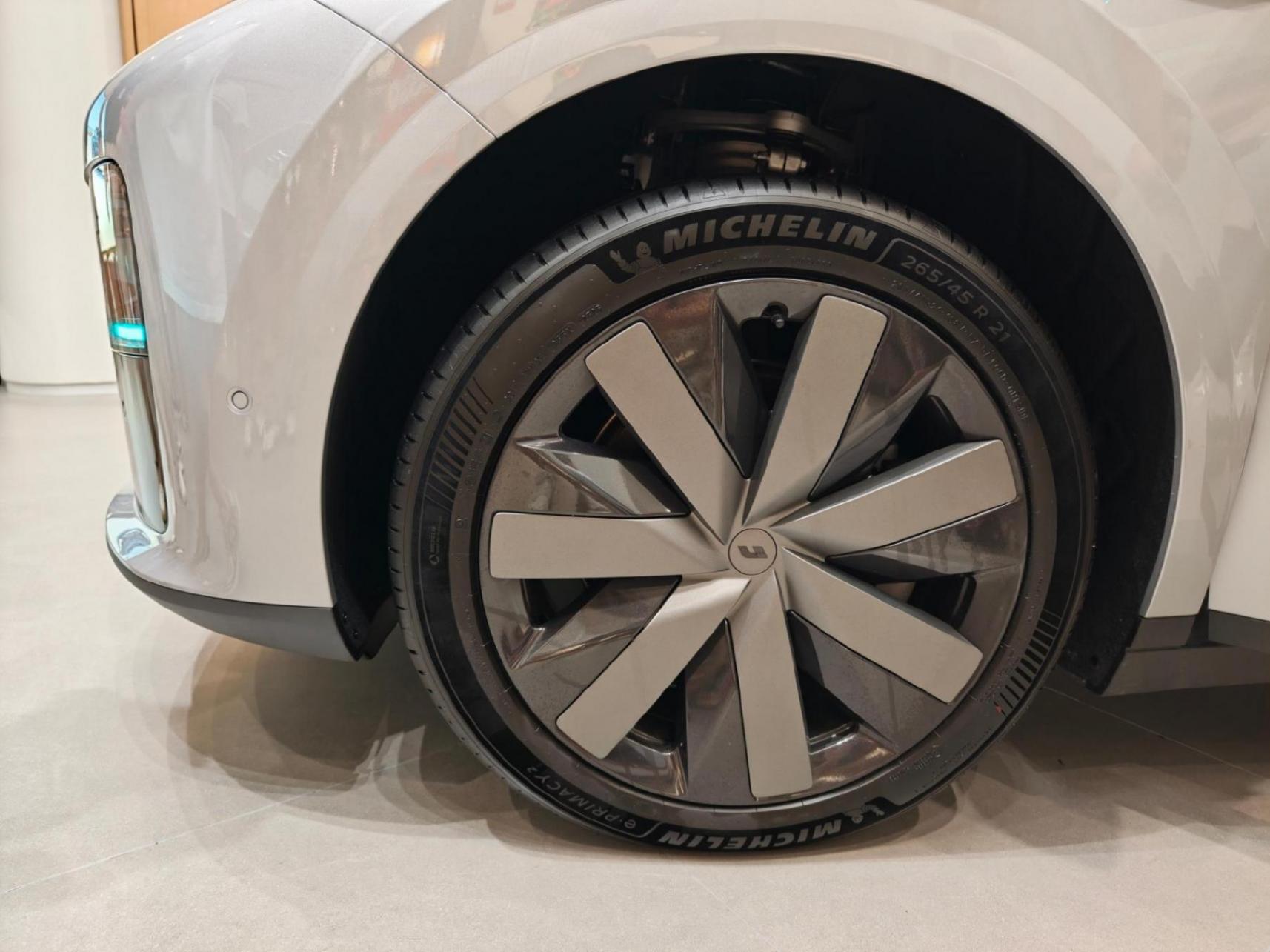 3、低配采用21英寸刀鋒、低風阻輪轂,輪胎是我非常喜歡的米其林e聆悅二代,降噪性能應該很出色。采用傳統隱藏式門把手,可以機械拉開,帶電吸門功能。