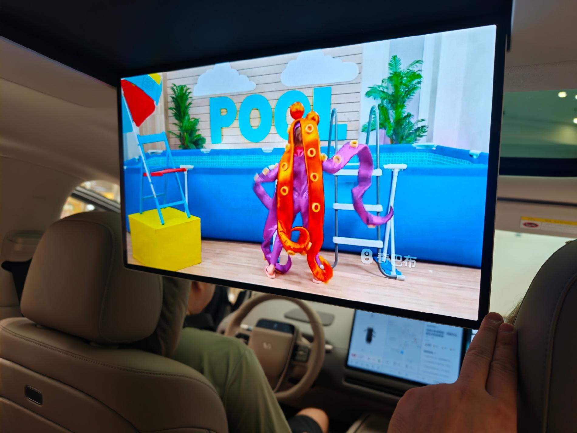 6、第二排空間上問題不大,主要是感覺細節創新不足。比如手動遮陽簾、電彈電冰箱、傳統招財貓扶手、后排零重力等等,都屬于業內主流水平,沒有體現出理想的創新優勢。當然,第二排吸頂屏尺寸還是夠大。