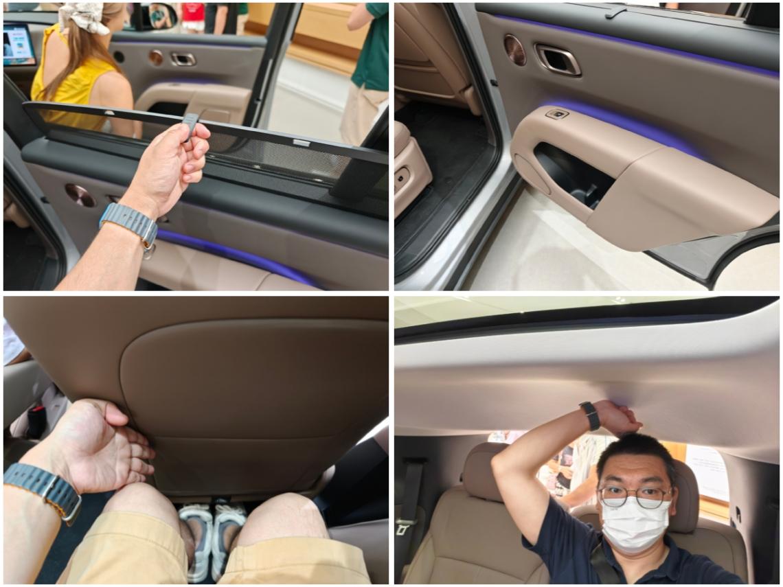 5、主駕前面增加了一個揚聲器和互動氛圍燈,雙聯屏在前IP臺更接近嵌入設計,HUD尺寸應該沒有變化,無線充電面板依然沒有植絨設計。整個前艙最大的問題是配置變化不大,相比最近體驗過的60英寸HUD、17.3英寸大屏這些更有分量感的前艙配置,覺得略顯小氣。