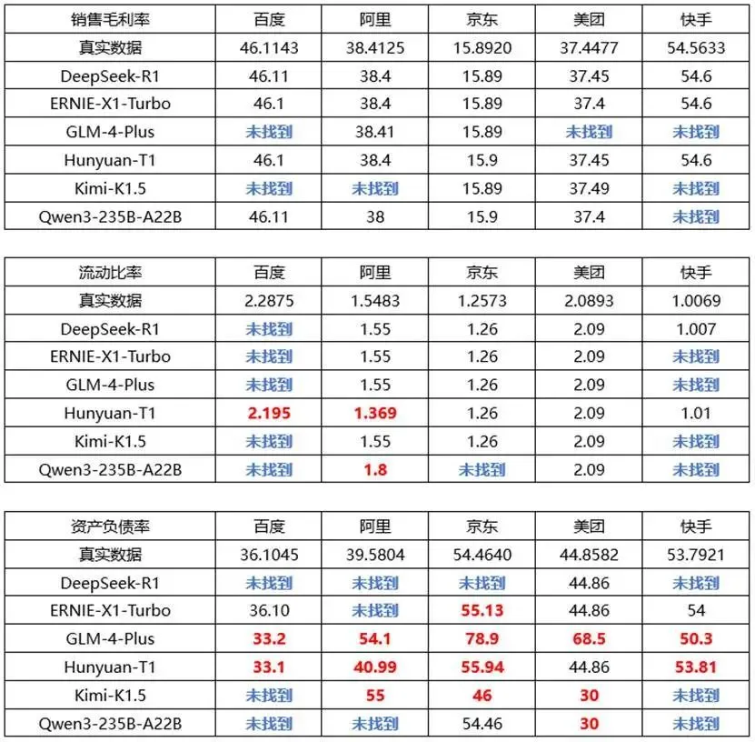 GLM-4-Plus和HunyuanT1表現較差,尤其是在計算資產負債率時,頻繁出現編造數據的情況。