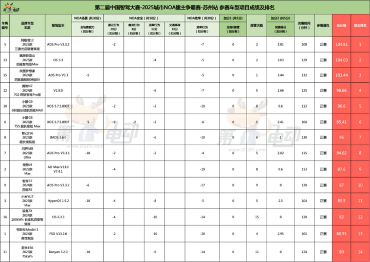 7月20日,第二屆中國智能輔助駕駛大賽第十九站之蘇州站城市NOA賽結果揭曉:華為系再次大放異彩,繼無錫站包攬前三后,本站比賽阿維塔12成功衛冕奪得擂主!魏牌藍山和嵐圖夢想家分獲二、三名。詳細成績單如下: