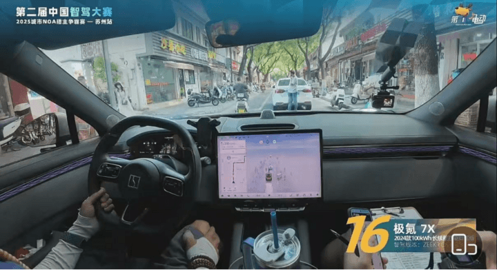 蘇州站的比賽路線難度非常大,考點賽前全部隱藏,全程22公里,經過38個紅綠燈,5個途經點,6個考點,在社區窄路、潮汐車道、商圈窄路+感應道閘、人造限寬墩、掉頭、環島等交通場景,對參賽車輛的城市NOA智駕能力進行考驗。