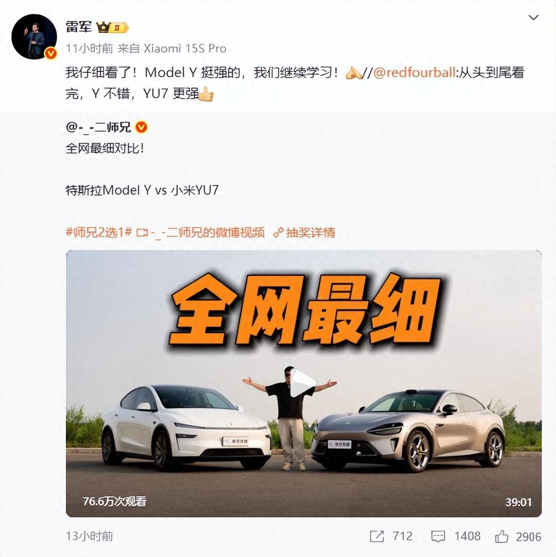 當晚,雷軍公開轉發表示:“Model Y挺強的,我們繼續學習”。