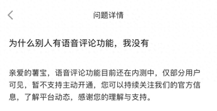 7月22日,針對小紅書語音評論功能,小紅書社區客服回應稱,語音評論功能目前還在內測中,僅部分用戶可見,暫不支持主動開通。