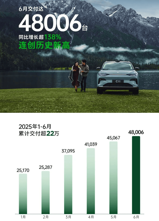 從已公布的銷量數(shù)據(jù)看,零跑成最大黑馬,上半年累計(jì)交付221664輛新車,同比增長達(dá)156%,首度登頂半年銷量榜。再看今年6月,零跑單月的全系交付量也已經(jīng)來到4.8萬輛,同比增幅超過138%,創(chuàng)歷史新高。不過,零跑的逆襲有跡可循,自2024年起,零跑便進(jìn)入高速增長期,2024年實(shí)現(xiàn)104%的顯著增長,2025年連續(xù)4個月蟬聯(lián)新勢力銷量冠軍。