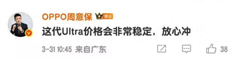 今年4月,OPPO發(fā)布Find X8 Ultra,起售價(jià)6499元。發(fā)布前,F(xiàn)ind系列總經(jīng)理周意保在微博為這款新品預(yù)熱稱:“這代Ultra價(jià)格絕對(duì)穩(wěn)定,放心沖!”