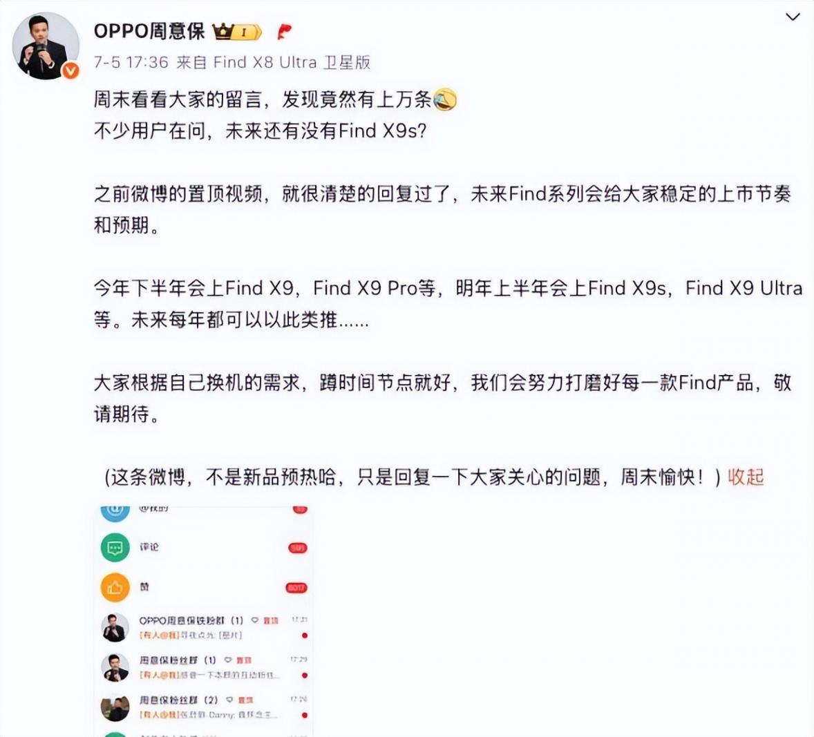 有意思的是,之前OPPO Find系列的產品負責人周意保透露過一些未來的產品規劃。他說Find X9和Find X9 Pro會在今年下半年發布,Find X9s和Find X9 Ultra則要等到明年上半年。所以很多人都在猜,Find X9系列很可能會第一個用上和哈蘇合作的下一代移動影像系統。