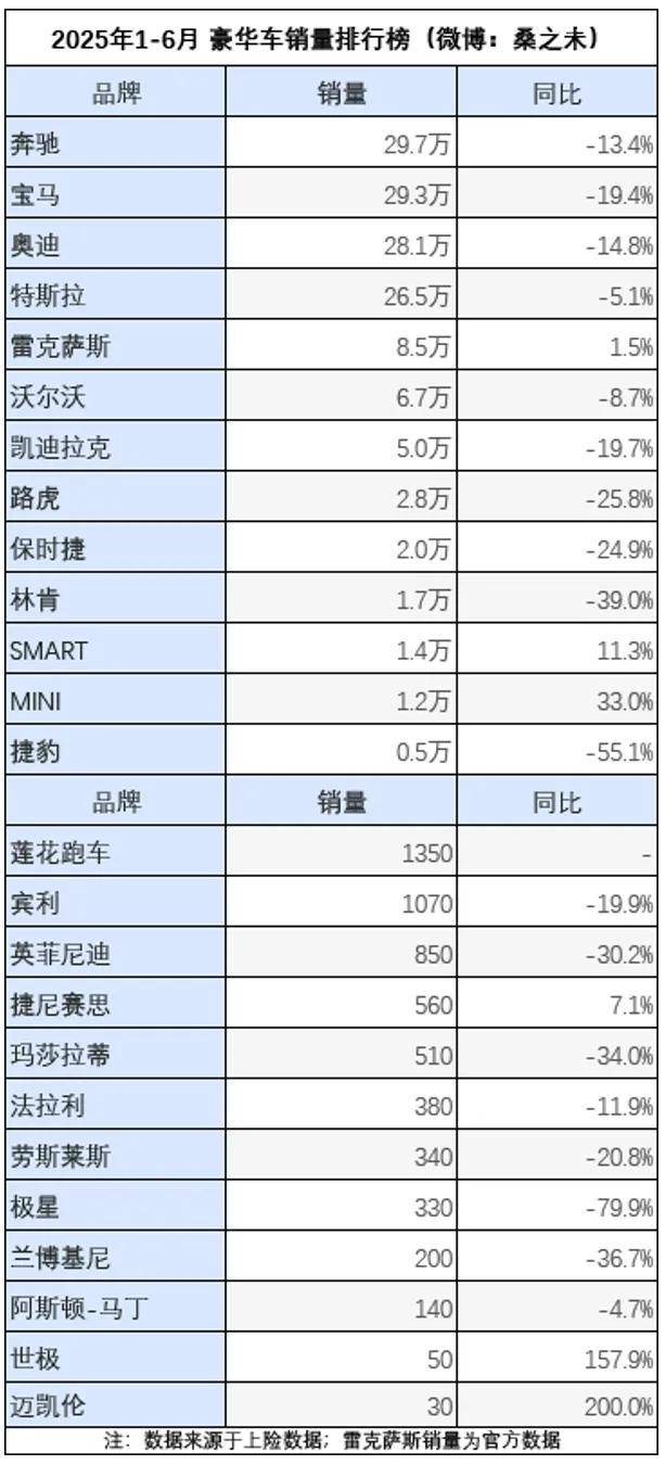 如果只看進口車銷量排行,根據筆者統計,伴隨著2025年上半年進口車銷量進一步下滑,奔馳、寶馬、保時捷、奧迪的進口車銷量均同比下滑。其中,奔馳進口車同比下滑12.2%,寶馬進口車下滑24.6%,保時捷下滑24.9%,奧迪進口車下滑37.1%,而雷克薩斯保持了銷量的穩中有升。