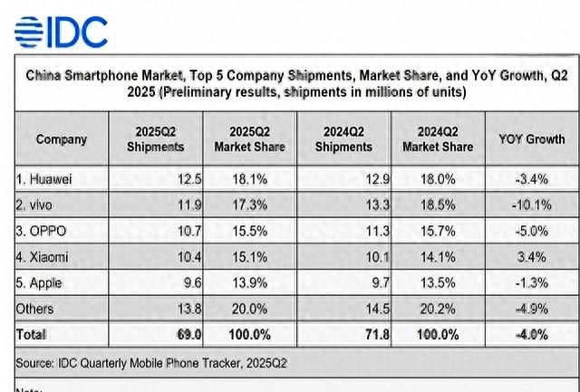 2025年二季度中國手機市場大洗牌,華為時隔四年重回第一,出貨1250萬臺占18.1%份額,蘋果跌到第五僅960萬臺還連跌八季。