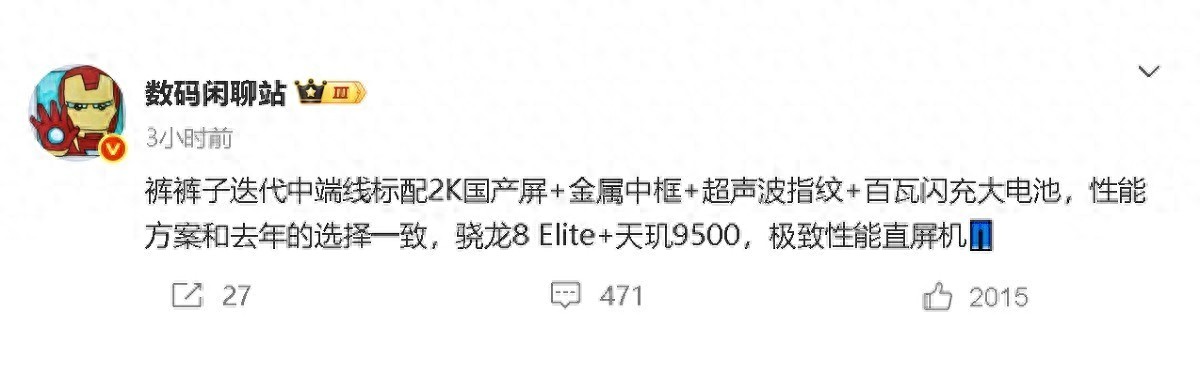 數碼博主爆出消息,iQOO要出新款中端機了。這次配置堆滿,屏幕是2K直屏,金屬邊框,指紋解鎖支持濕手解鎖,充電功率100瓦,電池7000毫安時。芯片有兩種選,驍龍8E2或者天璣9500,跑分能到200萬。這明顯是要跟紅米K90干上了。