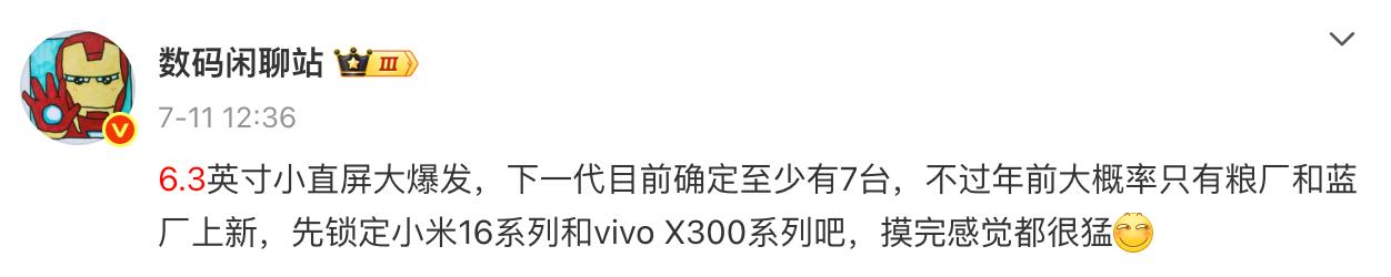 爆料說,像 6.3 英寸這種小直屏,下一代至少會有 7 臺。目前已確定的有,小米 16、小米 16 Pro、vivo X300、OPPO Find X9s、一加 15T、榮耀 Magic8 mini、iQOO 14 mini(暫稱)。