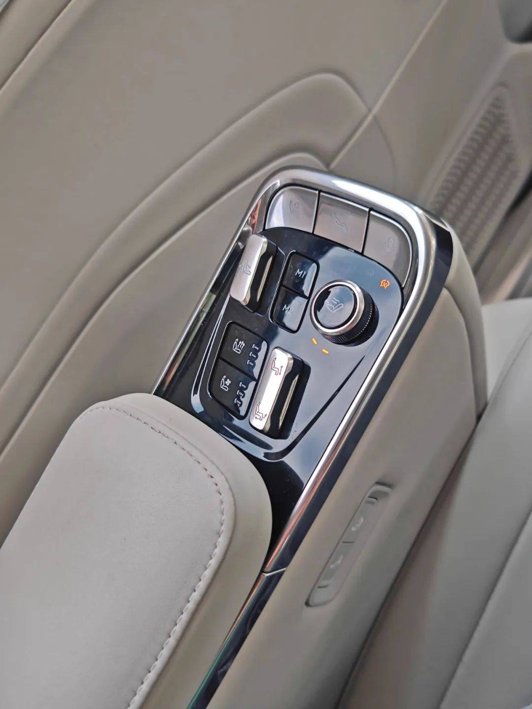 如果你問我這樣的方式好不好用,老實說可能由于筆者思想比較老一套,所以我還是覺得傳統的機械控制鍵、旋鈕方式更直觀一點。但還好,EM90的二排座椅控制還是采用象形機械撥桿與按鍵來操作,只要將座椅扶手上蓋向后滑開就能輕松找到,而且由于展開為休憩型態所需的椅背向后放倒、腿托升起、前副手座往前滑……等一系列動作,都被組合成一鍵控制(回復坐姿原位也有一鍵控制),座椅通風、加熱、按摩功能也在這其中,所以操作起來非常便利。至于用來讓第三排乘客進出,將二排座椅進行前后滑移的按鈕,則被配置到座椅外側與內側靠近大腿位置旁,這樣的設計操作很方便,另一方面也有顧及安全的考慮,可避免二、三排座位上有人時不小心夾到。