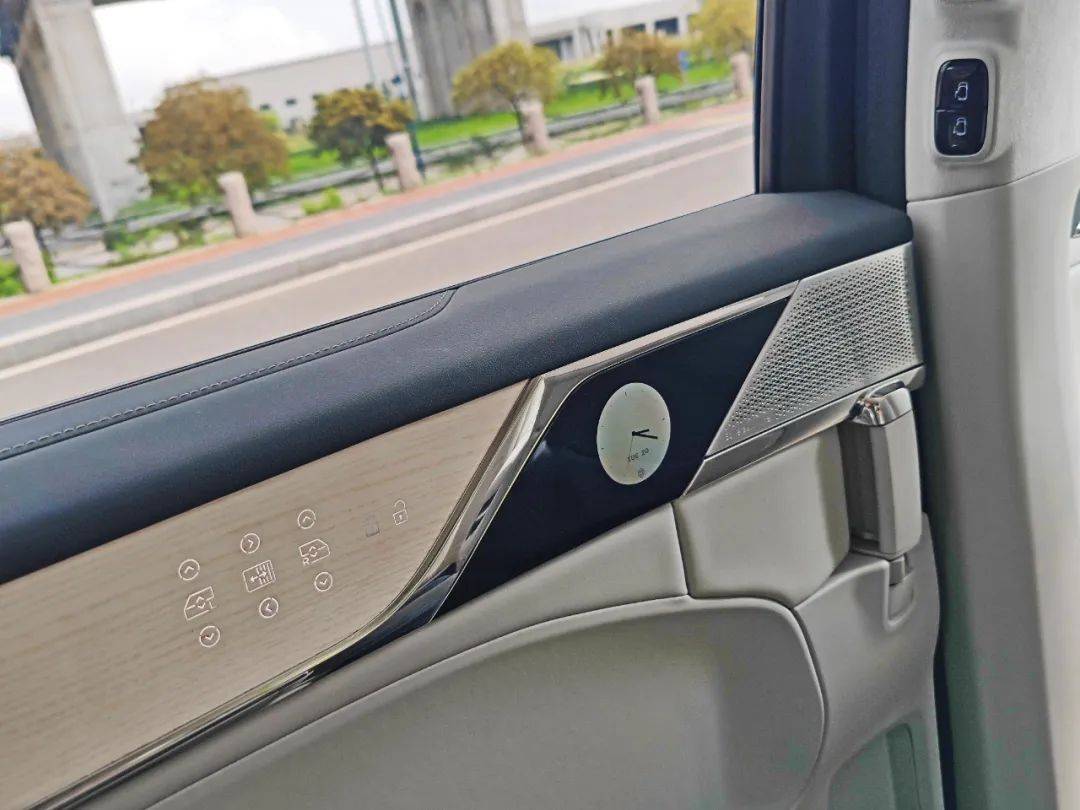 個人認為,像EM90這樣一款定位高端的MPV,要體驗它的內飾格局,首先當是打開側滑門坐進它的第二排座椅。然后緊接著,我就發現許多它和以往沃爾沃車不一樣的地方,例如側滑門窗、天窗遮陽簾……等機能的控制沒有實體按鍵,而是以隱藏在車門木紋飾板內,用燈光指示來觸控操作;另外還有車門旁有個顯示時鐘畫面的液晶小屏幕,很顯豪華腔調,并且如果觸控它還能調整空調溫度、風量……機能。這些科技感的營造,給我的感覺是很不沃爾沃,但很有國內新能源車流行的范兒,尤其像極氪009!