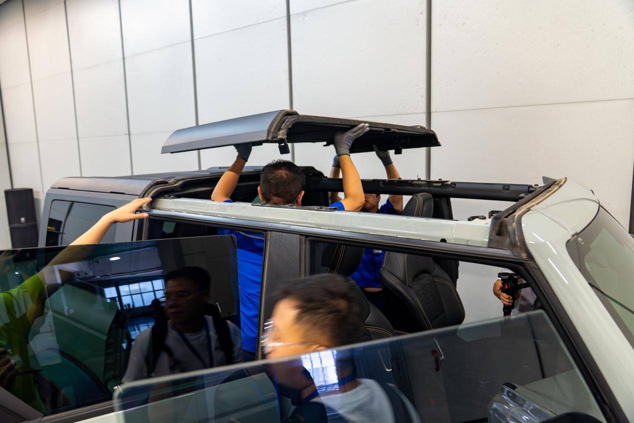 靜態體驗時,這套從第一代烈馬 GPW 模塊化車身延續至今的設計理念,經六代迭代已融入輕量化與智能化內核。從 1966 年初代車型確立的可拆理念,到如今覆蓋全車 20 余處的模塊化結構,每一代升級都在強化 “玩得盡興且用得省心” 的平衡。四片式車頂的設計尤為亮眼,采用蜂窩夾層 PU 增強復合材料,實現按壓式卡扣與輕量化復合材質的便捷組合,抗壓強度達 3.2 噸,耐受 - 40℃至 80℃極端溫度,惡劣環境下也能保持結構穩定。車門拆卸同樣便捷,單門操作簡化至 “擰螺栓 + 拔接口” 兩步,操作輕松,兼顧越野時的結構剛性與日常使用的便捷性。