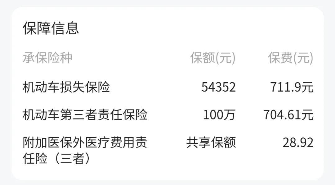 三者險因為這個車每年只開幾千公里,一般都是家附近買買菜,家在郊區,平時也遇不到百萬豪車,所以只上了100萬,保費704.61元。