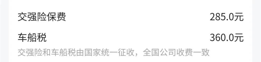 交強險依舊是最低價格285元,車船稅因為這臺車排量是2.0L,上海這邊是360元每年,這個不同地區會有差異。