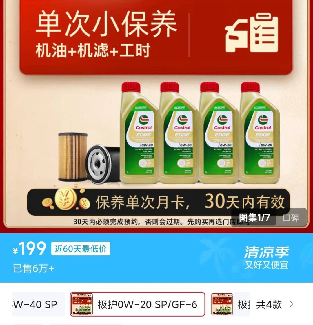 通常來說,基礎保養在APP里面可以選擇去哪做,會有一部分4S店可選。但是當你真的去到4S店用車險送的保養券時,4S店通常只會給你用最低級的機油(上圖的機油網上售價不到100元),如果想用更好的機油(比如SP級、滿足GF-6標準)得加錢。