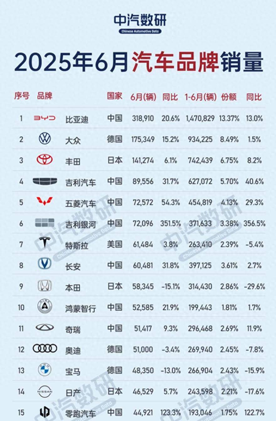 可以看到,6月汽車品牌銷量前十榜單中,中國品牌占據六席,合計銷量占比超四成,反映本土品牌全面崛起。值得注意的是,其中吉利銀河表現強勁,不論6月還是上半年均實現了超3倍的增長,成為上半年中國車市最大黑馬。如果再算上、,吉利集團上半年整體銷量接近130萬輛,在此基礎上吉利宣布將集團全年銷量目標調高至300萬輛。