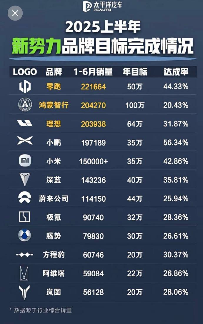 新勢力方面,今年上半年銷量前三的新勢力品牌分別為零跑、鴻蒙智行、理想,分別交付221664輛、204658輛、203938輛,均在20萬量級。此外小米汽車表現也十分出色,上半年累計交付超15.74萬輛,目標完成率達42.86%,僅次于零跑的44.33%和小鵬的56.34%。