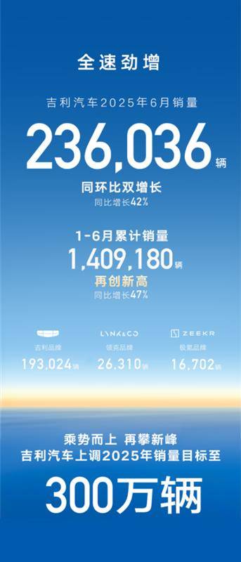 基于上半年超預期銷售表現及技術積累,吉利汽車已將全年銷量目標上調約11%,由271萬輛增至300萬輛。