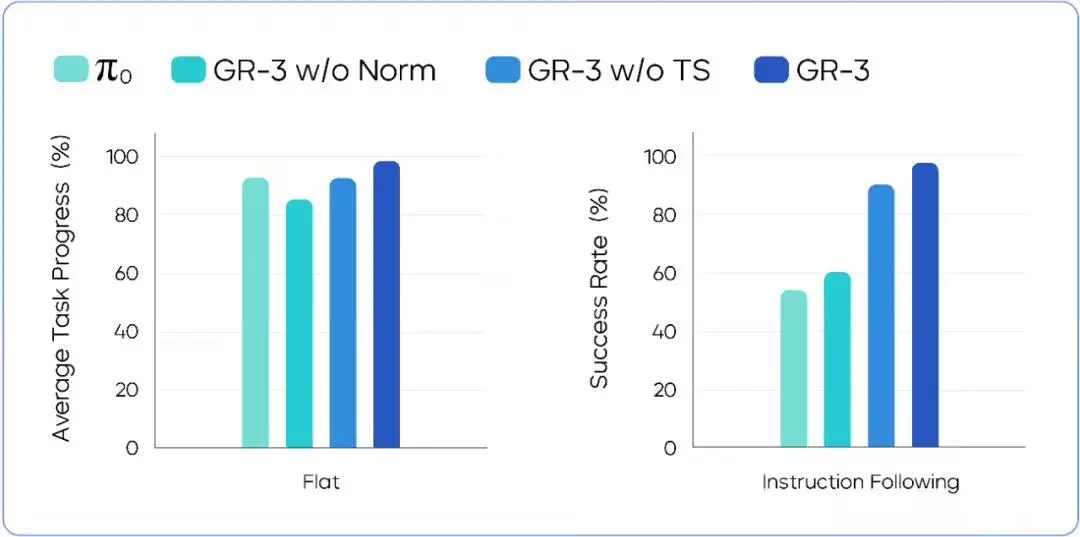 團隊還同時測試了 GR-3 跟隨分步指令的能力,結果發現:GR-3 在跟隨語言指令上,領先基準模型,面對多件同類物品(如多個杯子),GR-3 能按指令將他們“全放進垃圾桶”,若指令無效(如餐桌上沒有藍色的碗,指令為“把藍色碗放進籃子”),GR-3 能準確判斷并保持不動,而基準模型則會隨機拿取物品。