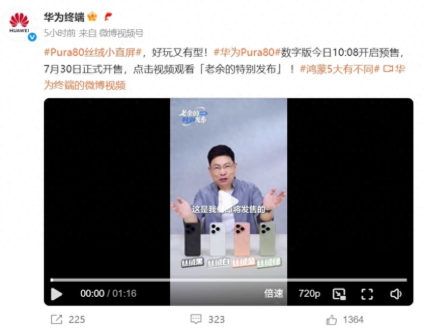 “華為終端”官方微博消息,華為Pura80數字版今日(7月23日)10:08開啟預售,7月30日正式開售。