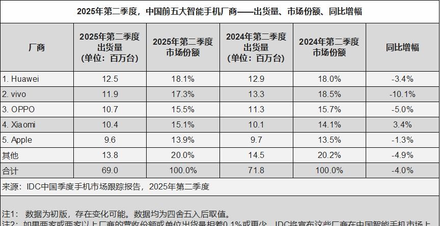 這份報告還顯示,整個中國智能手機市場今年上半年出貨量1.4億臺,和去年同期差不多。雖然華為拿了第一,但手機銷量其實比去年少3.4%。其他品牌里,vivo、OPPO、小米和蘋果緊隨其后,差距都不大。只有小米銷量增長3.4%,是頭部品牌里唯一上漲的。