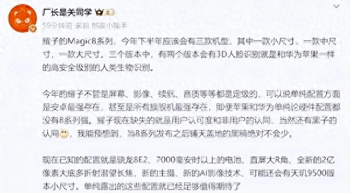 最近網上有消息說榮耀要發新手機,叫Magic8系列。主要參數挺嚇人,主攝傳感器有1英寸那么大,長焦鏡頭能拍2億像素,還裝了7000毫安的大電池。這些配置要是真落實,明年安卓陣營的競爭應該會更激烈。