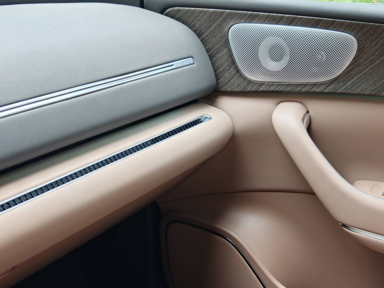 5、 車內(nèi)的豪華感也大幅提升,更簡潔的弧形型面、大量的軟材質(zhì)包裹,Nappa環(huán)保真皮及飾件工藝升級,顏色搭配上砂巖棕和銀色的音響面板,加上部分木紋飾板,很有奔馳的感覺。