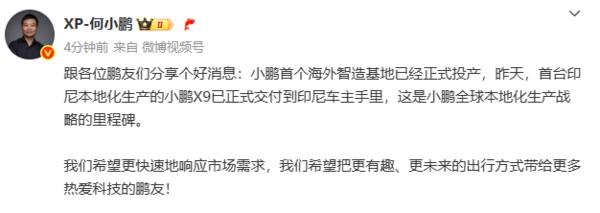 了解,小鵬汽車董事長、CEO何小鵬發布最新微博稱,7月23日,首臺印尼本地化生產的小鵬X9已正式交付到印尼車主手里,這是小鵬全球本地化生產戰略的里程碑。