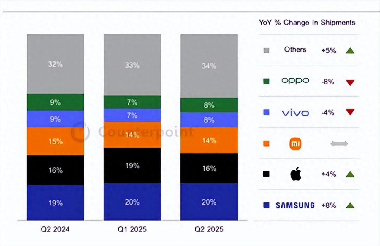 按照機(jī)構(gòu)的數(shù)據(jù),2025年二季度時(shí),小米在全球的份額為14%,離蘋果只有2%的差距了,而這也是小米連續(xù)多年,排在全球第三名了。