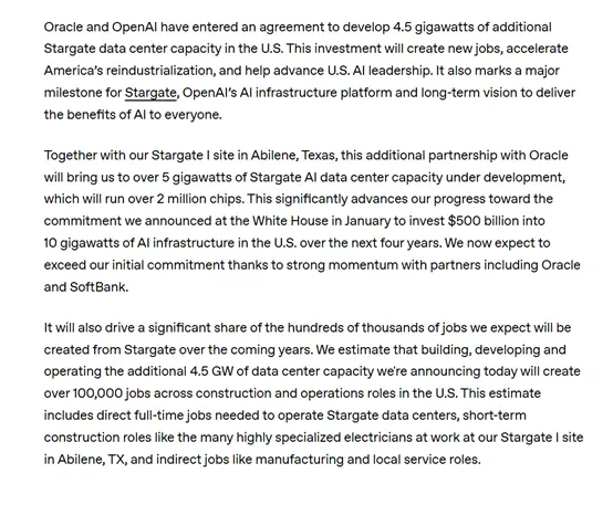 甲骨文和OpenAI達成了一項協議,計劃在美國開發額外4.5吉瓦的Stargate數據中心容量。這一投資將創造新的就業機會,加速美國的再工業化進程,并助力美國在人工智能領域的領先地位。這同時也標志著Stargate的一個重要里程碑,Stargate是OpenAI的人工智能基礎設施平臺,其長期愿景是將人工智能的益處普及到每一個人。