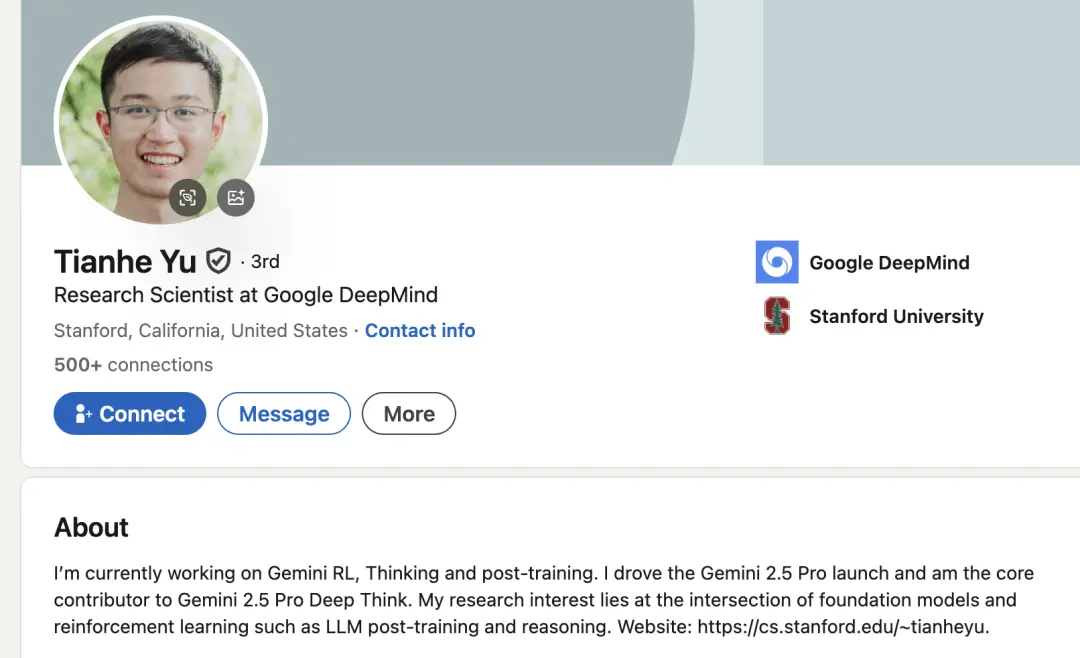 Tianhe Yu任谷歌DeepMind的研究科學(xué)家,負責Gemini的強化學(xué)習、思考和后訓(xùn)練,還推動了Gemini 2.5的發(fā)布,是Gemini 2.5 Pro深度思考的核心貢獻者。
