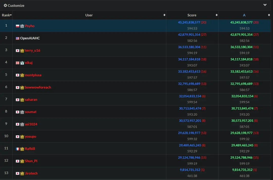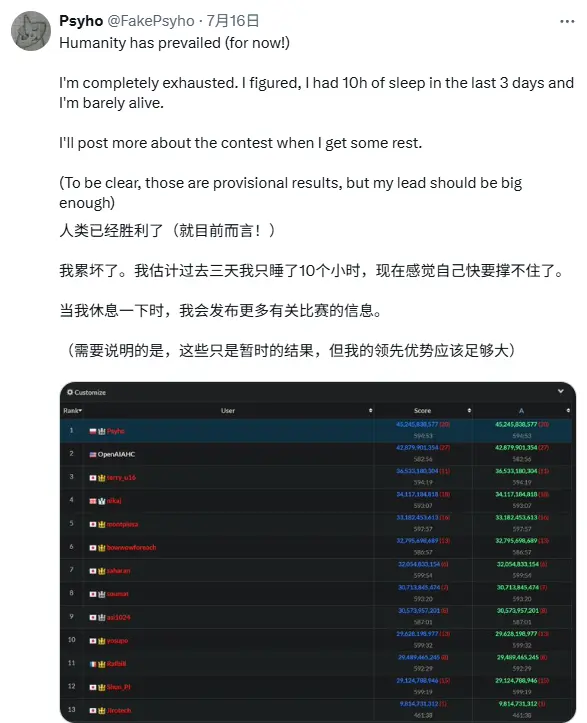 接著,就到了人類的追趕時刻。在比賽進(jìn)行到第7小時左右,一位名叫 Psyho 的人類選手成功反超了AI。