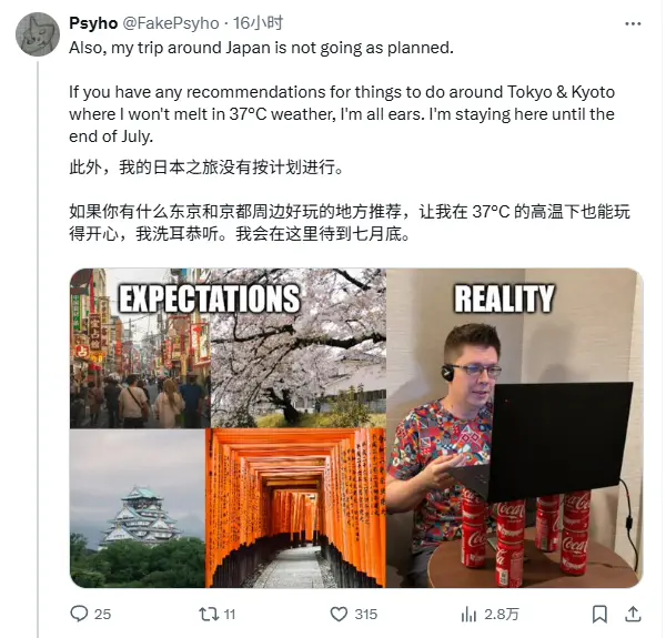 比賽結(jié)束后他還在東京待著,當(dāng)網(wǎng)友建議他去徒步旅行時,他的回應(yīng)是:“什么地方能讓我在37度還玩得開心,說來聽聽。”還順便配了張圖。。