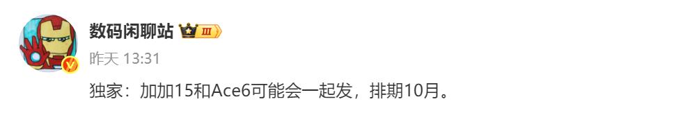 搭載驍龍8至尊版處理器,而pro版則和一加15一樣采用驍龍8 Elite 2處理器,排期在10月一起發布,三款手機之間有不同的差距,定位上還是一加15更強,不過這次ace 6 pro也會給到潛望式長焦,雙旗艦去對抗紅米。