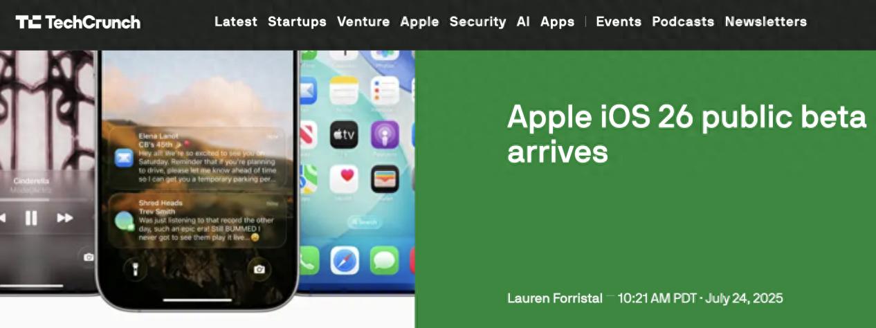 7月25日消息,據(jù)techcrunch報(bào)道稱,蘋果公司今日面向全球用戶發(fā)布 iOS 26 首個(gè)公開測(cè)試版,并同步推出 iPadOS 26、macOS 26、watchOS 26 與 tvOS 26 的對(duì)應(yīng)版本。此次更新被蘋果稱為“自 iOS 7 以來(lái)最大視覺革新”,帶來(lái)全新“液態(tài)玻璃”設(shè)計(jì)語(yǔ)言,并全面增強(qiáng) AI 功能。