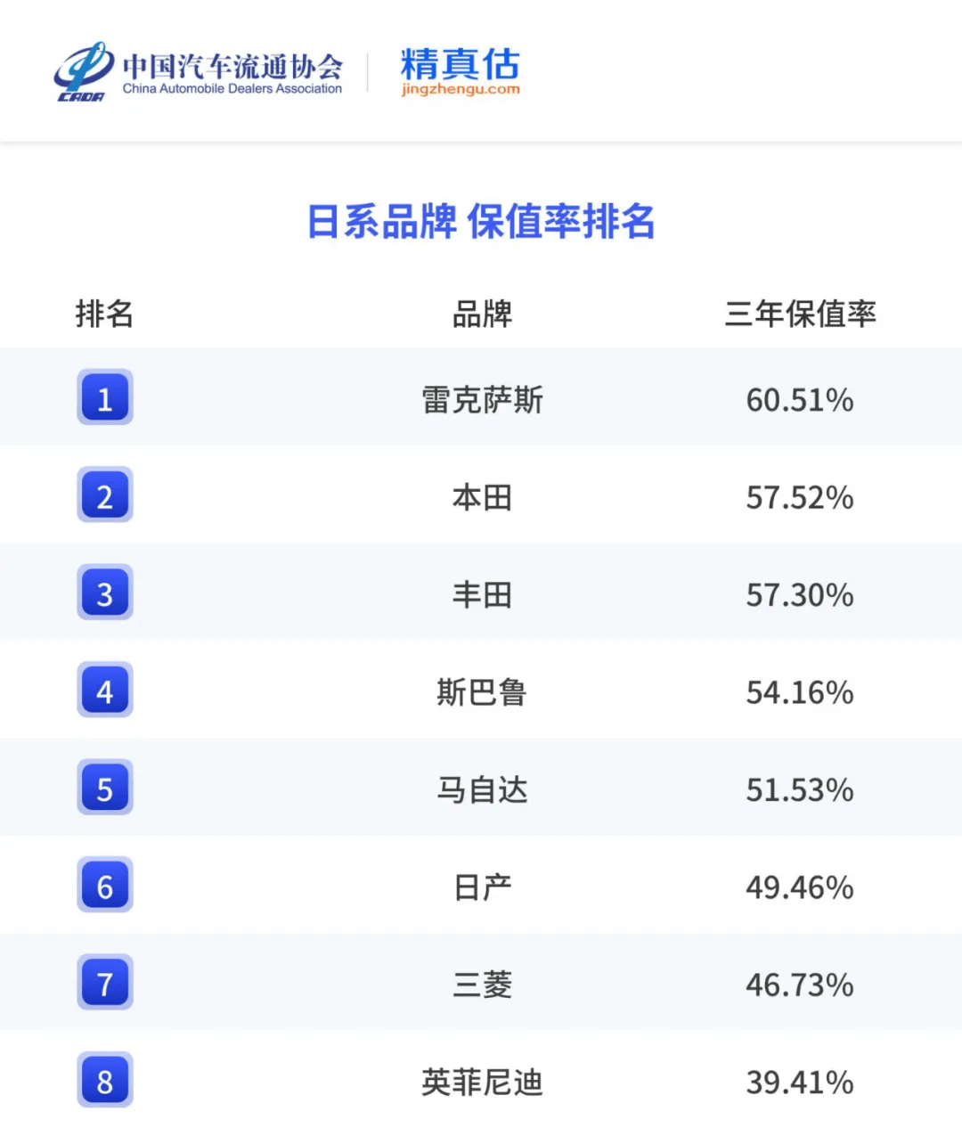 論保值,雷克薩斯是日系品牌三年保值率冠軍。據《2025上半年中國汽車保值率研究報告》,該品牌整體以60.51%的三年保值率,穩居日系品牌榜首。ES系列以63.89%,位列進口中大型車第一;NX系列則以56.18%,躋身進口中型SUV前三。