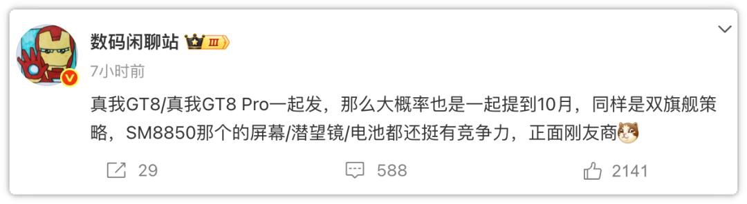 僅隔一天,真我也有消息了!7月24日,站哥再次爆料:“真我GT8/GT8 Pro一起發,大概率也是一起提到10月,同樣是雙旗艦策略,第二代驍龍8至尊版的屏幕/潛望鏡/電池都還挺有競爭力,正面剛友商!”